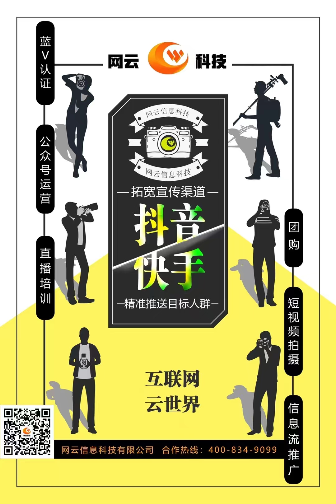 網(wǎng)云自媒體服務(wù)種類多樣,包括藍(lán)v認(rèn)證、團(tuán)購、公眾號運(yùn)營、短視頻拍攝、信息流推廣、直播培訓(xùn)??旌臀覀兒献魍貙捫麄髑溃珳?zhǔn)推送目標(biāo)人群吧。