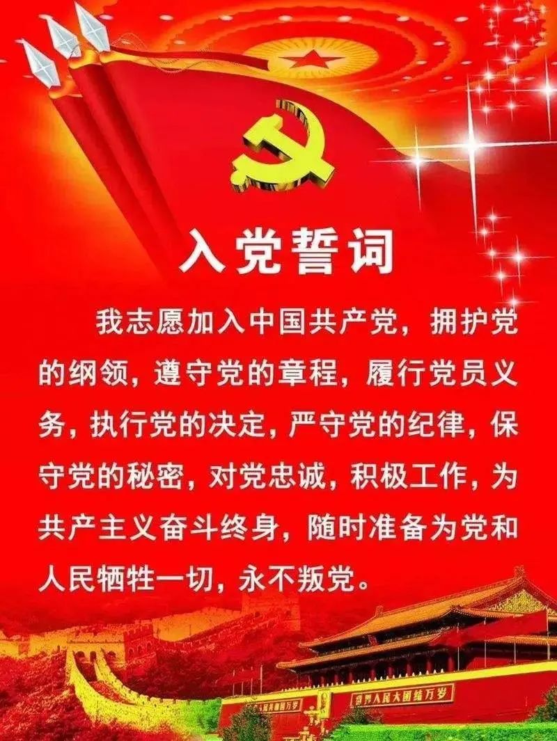 我志愿加入中國共產(chǎn)黨,擁護黨的綱領(lǐng),遵守黨的章程,履行黨員義務(wù),執(zhí)行黨的決定,嚴守黨的紀律,保守黨的秘密,對黨忠誠,積極工作,為共產(chǎn)主義奮斗終身,隨時準備為黨和人民犧牲一 切,永 不叛黨。